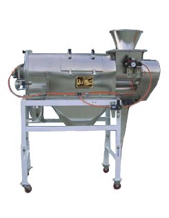 本设备筛网为圆筒状,置于机体内,物料通过螺旋输送系统后,和气流混合、雾化进入网筒内;通过网筒内风轮叶片使物料同时受离心力和旋风推进力,从而迫使物料喷射过网,由细料排出口排出,不能过网的物料沿筒壁从粗料排出口排出。